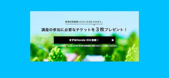 ただいま、『Honda ASOBI BASE』新規利用登録でイベントに参加するために必要なチケットを3枚プレゼント中!