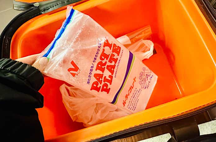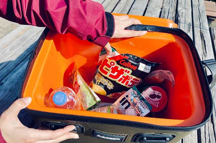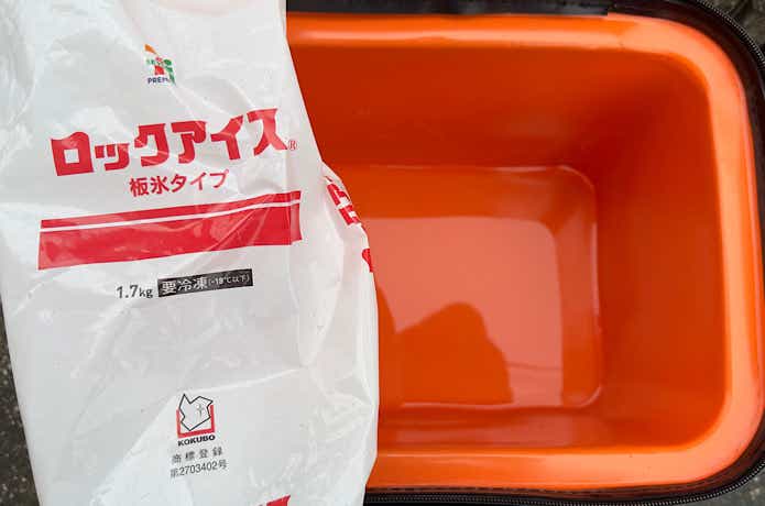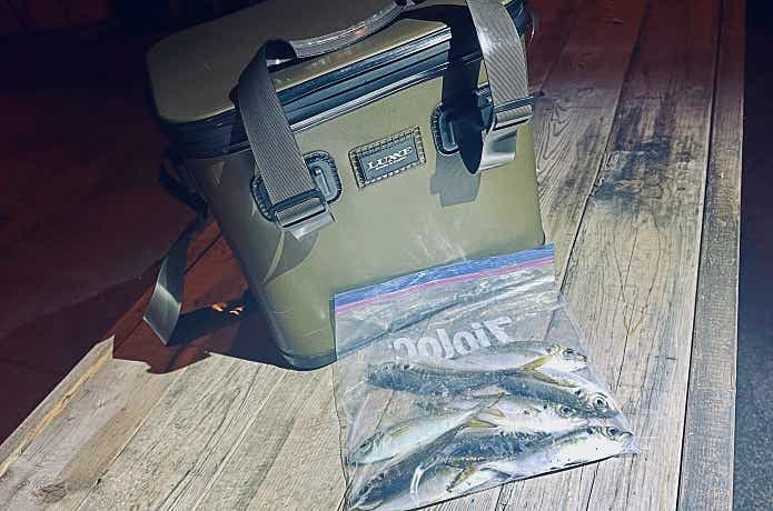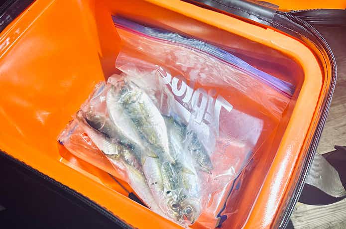 今回はアジが釣れたので、タックルケースを取り出し、ジップロックに入れた魚を氷の上に置きました。