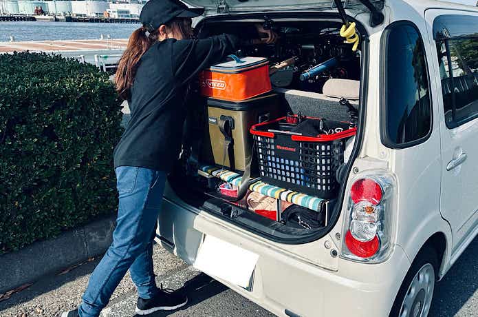 もし釣れたら魚はフリッジボックスへ、タックルケースは外に出して持って帰ります。