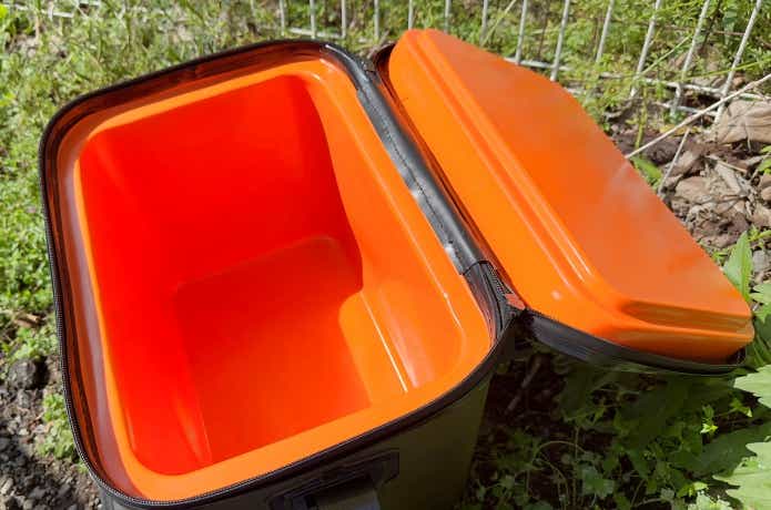 このセミハードクーラーは、一般的なバッカンに分厚い断熱材が入ったイメージで、潰れにくい仕様です。