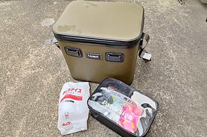 小さめのタックルケースにルアーや小物類一式を入れ、氷や保冷剤と一緒にフリッジボックスの中へ入れて現場に向かいます。