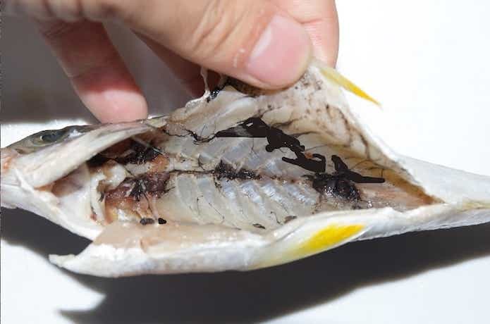 同じ腹黒な魚としてサヨリが挙げられますが、サヨリは海面直下を泳ぐため、強い紫外線から内臓を守るために腹腔膜が黒いです。
