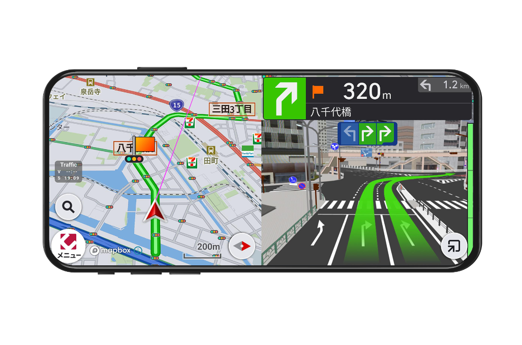方面看板、推奨レーンなど必要な情報を瞬時に把握できる表示で的確にドライバーを導きます。