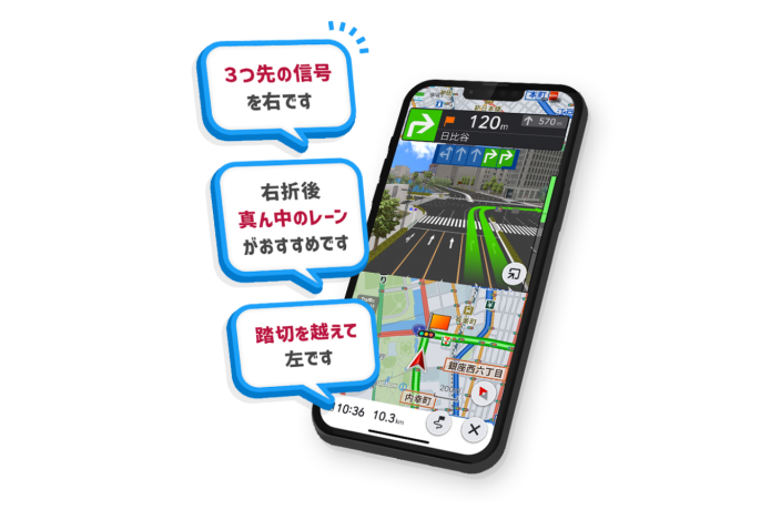 音声案内だけでも目的地に辿り着けるよう、瞬時に判断しやすい言語表現でナビゲーションします。