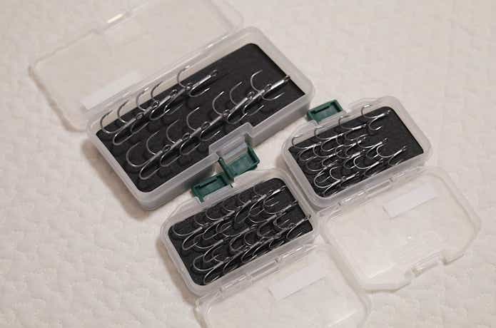 駐車場から釣り場までが遠くて気軽に戻ってこれないような状況では、その日に使用する頻度が高いであろうフックを、2種類以上計15本程度携行するようにしています。