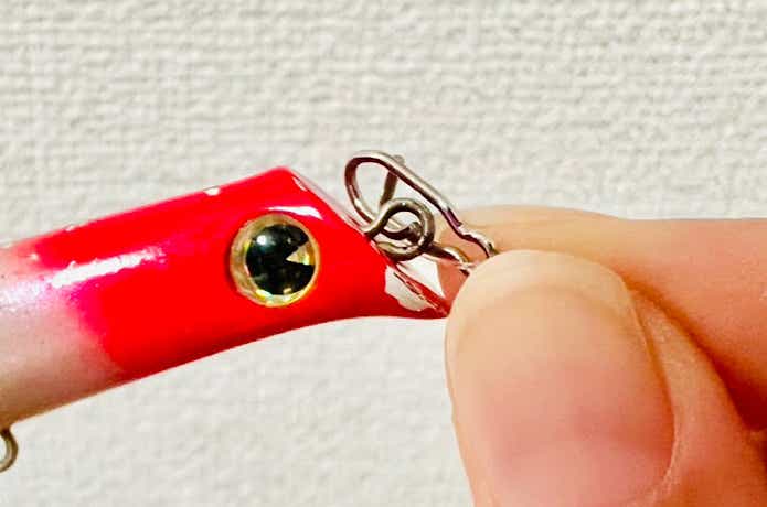 通常のスナップは“開けて閉じる”という動作を行わなければなりませんが、こちらのファストスナップは開閉の動作はなし。ただルアーのアイをはめるだけで装着できちゃう画期的なスナップなんです。