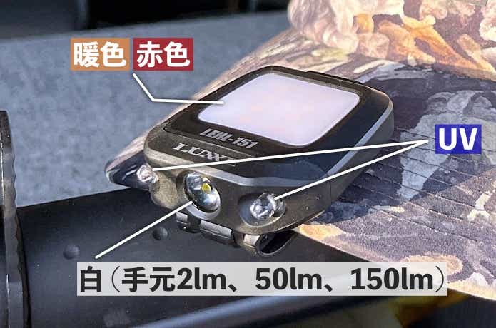 LEHL151は、白(最大150lm)・暖色・赤・UVの4色を搭載した充電式キャップライトです。