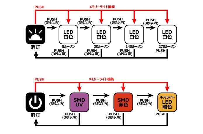 メモリーライト機能が付いておらず、暖色ライトを2段階経由しないと赤色ライトが点灯できない点だけは注意が必要です。