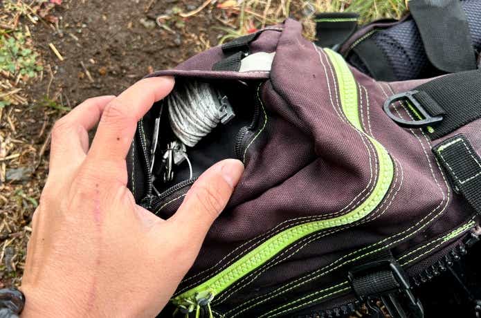 側面上部のDカンにはエアーポンプを付けてみたり、小物を入れたポーチをつけたりしています。