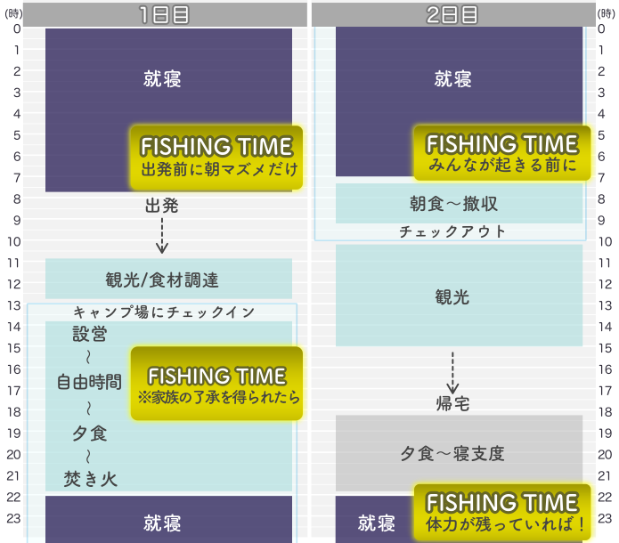 どれも実際に私が実践しているもので、スキマ時間を釣行に充てた家族優先プランです。