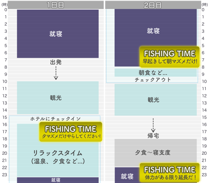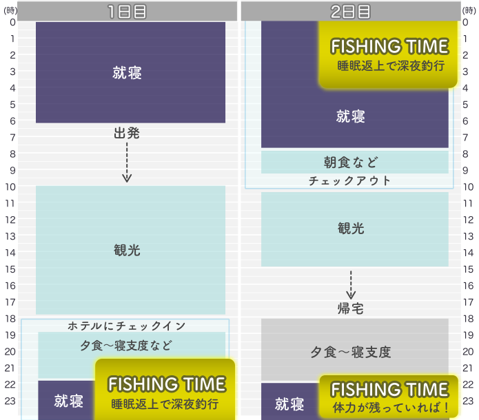 観光名所やテーマパークなど、シンプルな旅行に夜釣りをぶっ込んでしまおうというハードめのプランです。