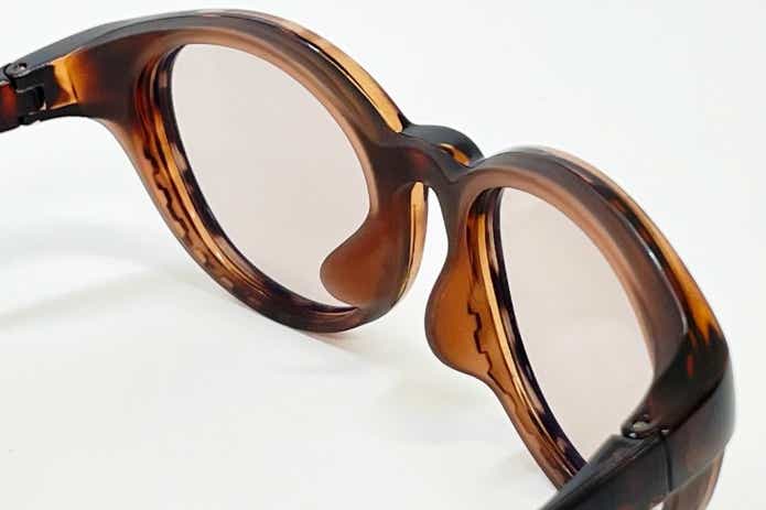 また、後方重心(テンプルを大きめに設計)により鼻にかかる負担を軽減。着用時に生じるズレ落ちも軽減し、見た目以上の軽やかなかけ心地です。