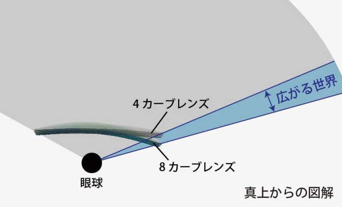 顔の曲面に沿う8カーブレンズを採用。(既存モデルは6カーブレンズを搭載)フレームが視界を妨げず、より広い視野を確保します。