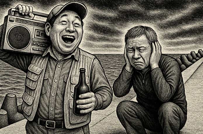 深夜の堤防で宴会気分の“爆音発生装置”。夜釣りなのに大声や爆笑、スピーカーで音楽を流せば、魚どころか近隣住民も一斉に逃げ出します。