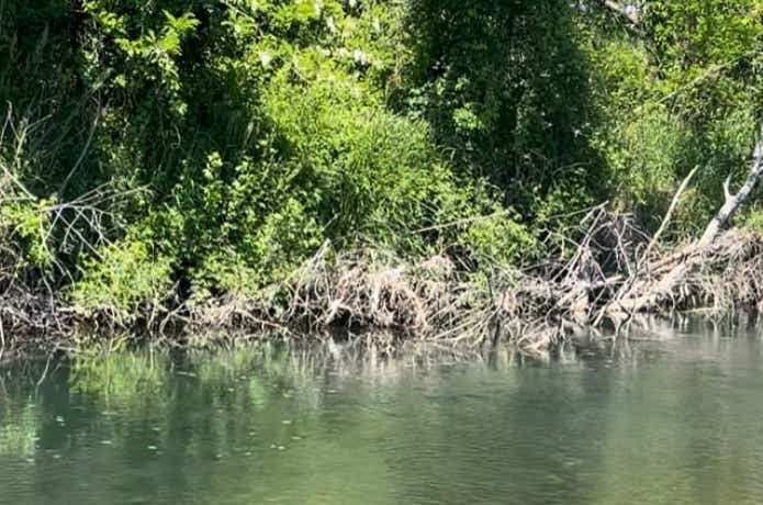 次のポイントは、対岸に倒木がたくさんあって小魚の絶好の棲家になっていそうな場所。