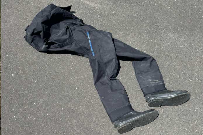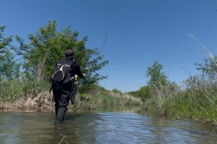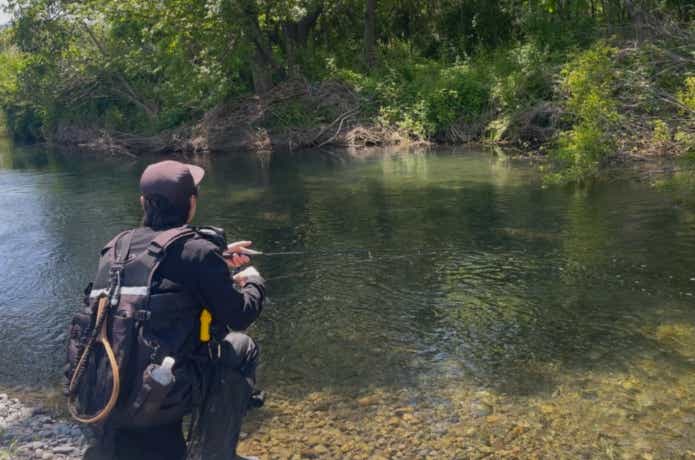 ちなみに今回は浅瀬を突っ切ってポイントを探すため、ウェーダースタイルでのトライ。