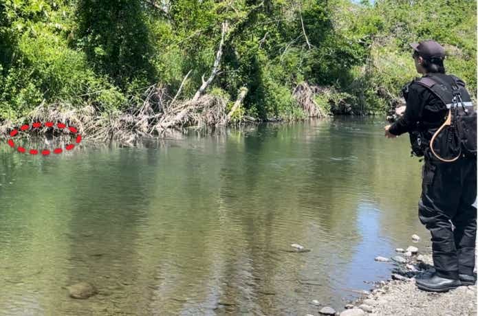 狙うは流れの奥の倒木沿いです。