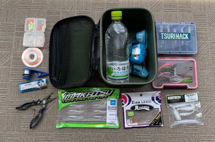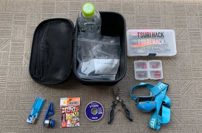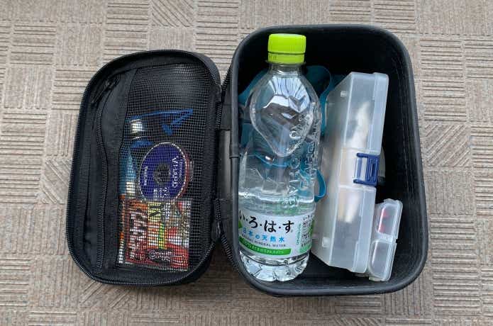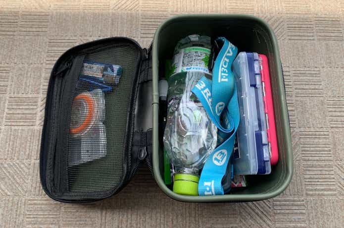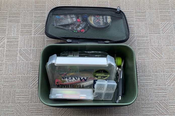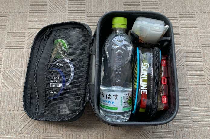 メインの部屋には、ジグヘッドケースとプラグケース、予備のワーム、プライヤー、ヘッドライト、そして水。