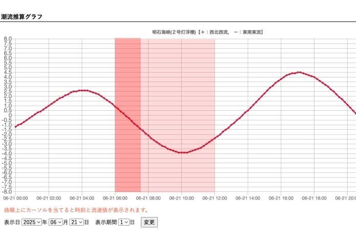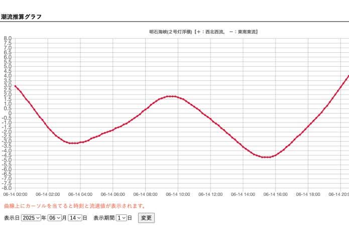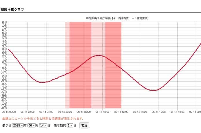 間違って潮汐表(タイドグラフ)を見ないように気をつけてください。潮汐表では潮流の強弱はわかりません。
