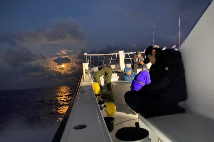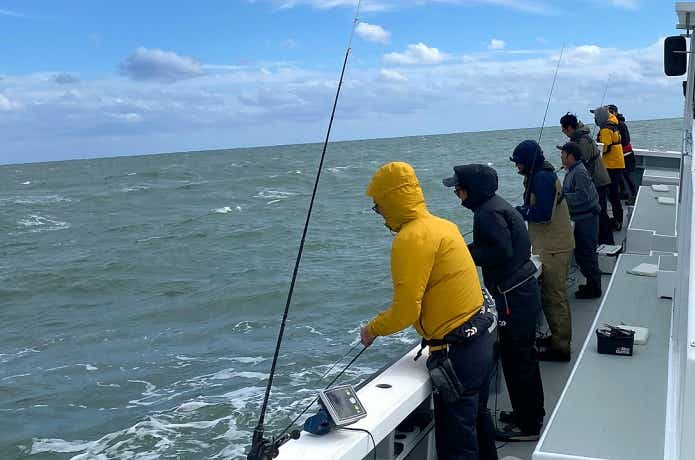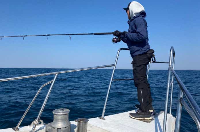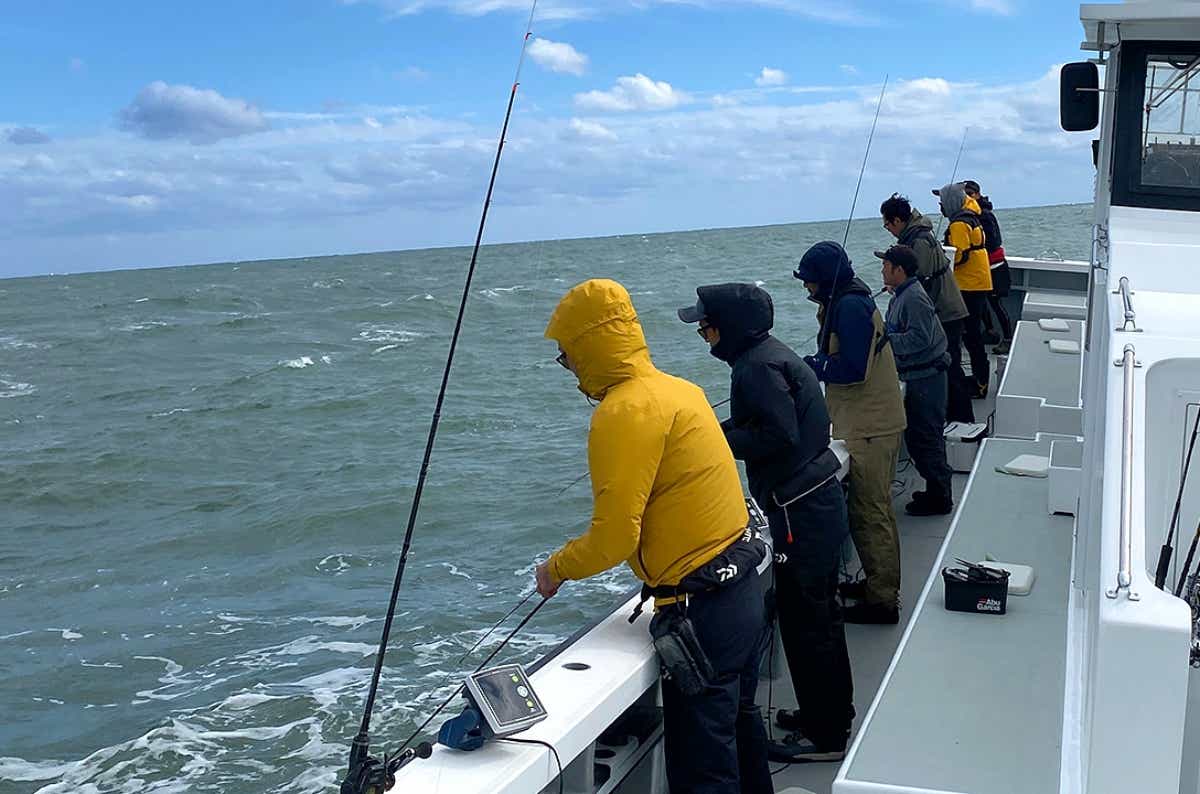 たとえば、ルアーを落としたら船の後ろに向かって流れていくーーそんなときは、あえて少し前方側に落とすことで、隣の人とのラインの交差を防ぐことができます。