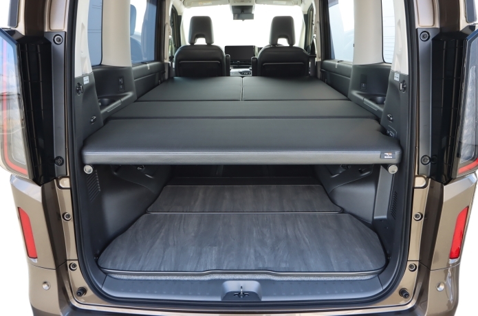 セカンドシートをフラットにし、専用フレームとマットを展開すれば、大人2人が無理なく横になれる広々とした就寝スペースが完成します。