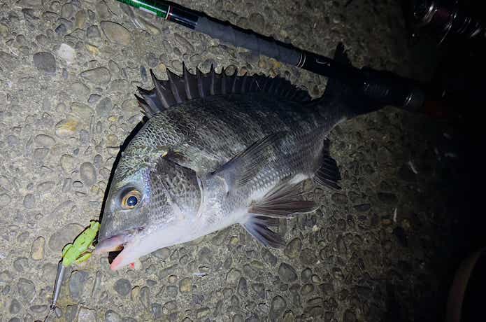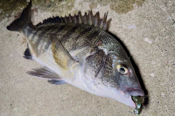 高水温でも比較的活性が良いクロダイ。甲殻類を模したソルトワームでネチネチ攻めましょう!