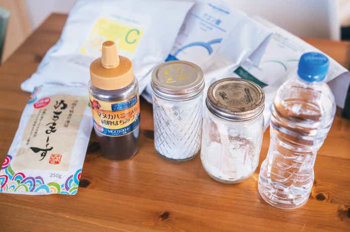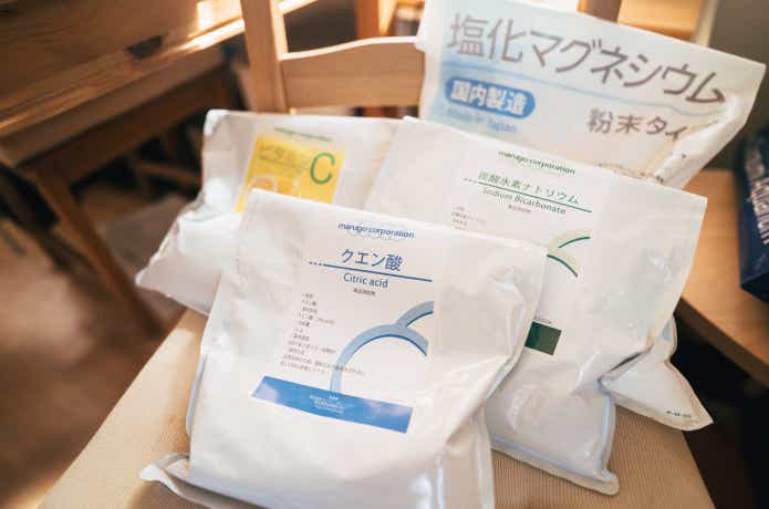 水、クエン酸、にがり(塩化マグネシウム)、塩(自然塩)、はちみつ(お好みで)、レモン果汁(お好みで)、ビタミンC、重曹(炭酸水素ナトリウム)などがあればOK。
