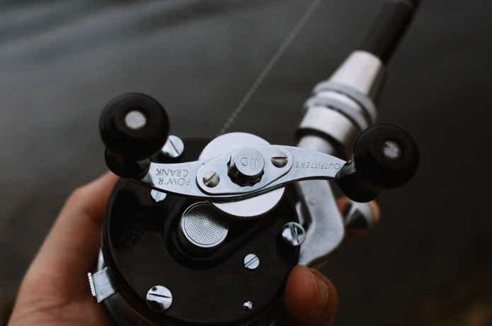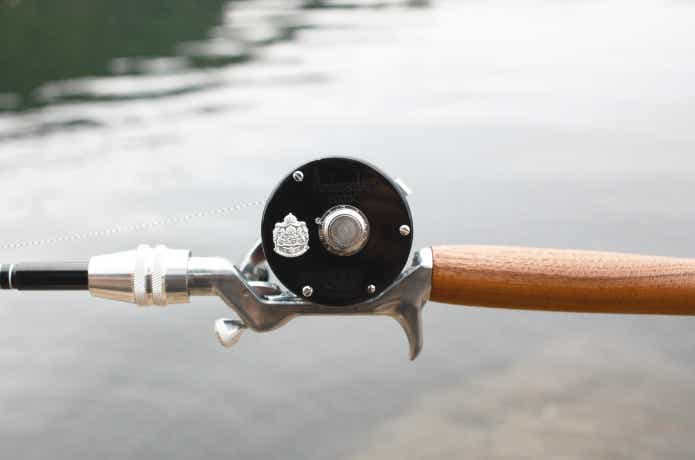 ハンドルをアウトフィッターズのパワークランクハンドル、スタードラグをブライトリバー・ABU用丸型ドラッグにしています。