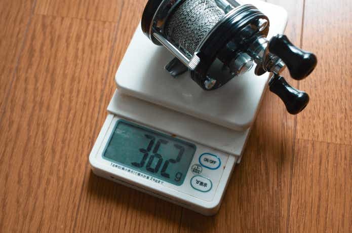 本体重量は約345g。リール単体でも、近年の軽量タックルのセットより重いほどです。