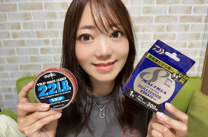 基本は左手にショックリーダー(白い紐)、右手にPEライン(茶色い紐)を持ちます。