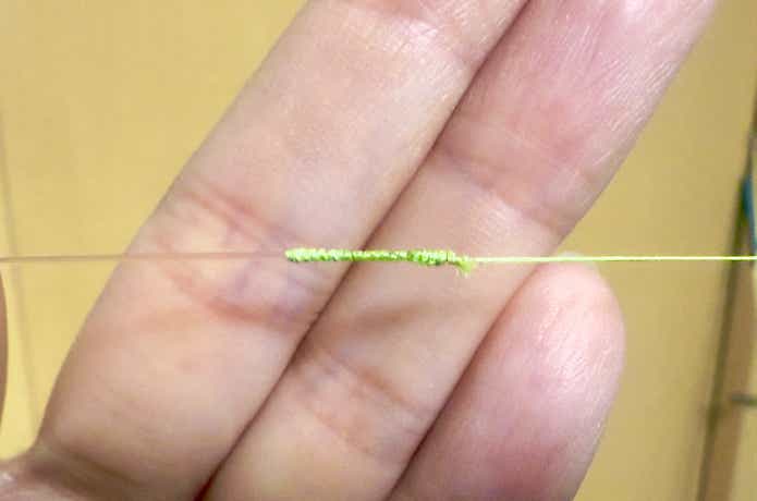 PEラインとショックリーダーが固く結束して色がこのように変われば締め込みができている証拠。