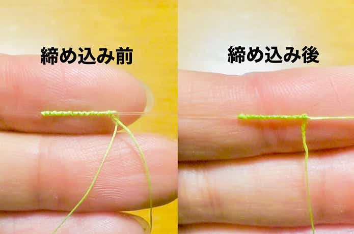 このノットは「結ぶ」というよりも、糸同士を編み込み、摩擦によって固定する構造です。