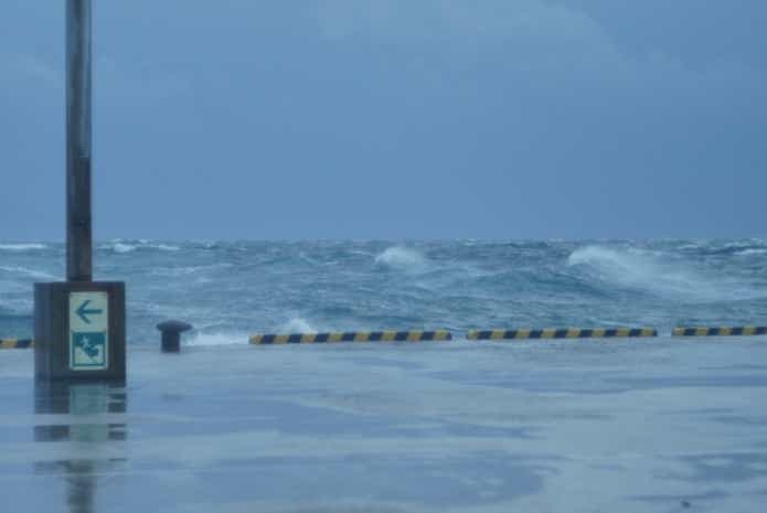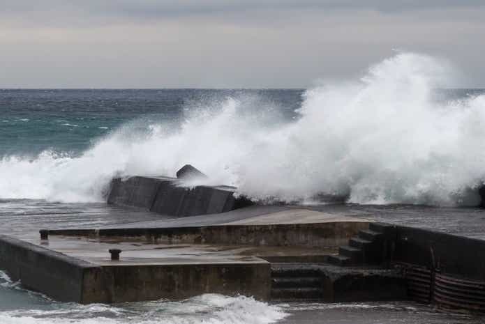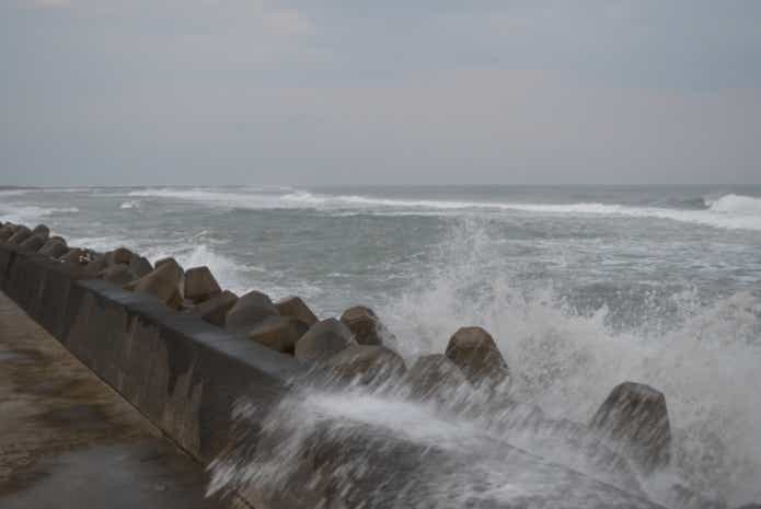 波浪警報 | おおむね波の高さが6m以上 | 沖堤やサーフは完全アウト。波浪注意報(3m以上)でも波しぶきや転落の危険。周期が短い波はとくに危険。 |
