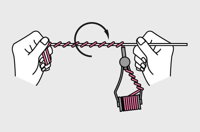 専用器具がリーダーから離れないようにテンションをかけ、手前から奥側に振り、右手側まで巻きつけていきます。※しっかりとテンションをかけ、ラインもしっかり張っておくことがポイントです。