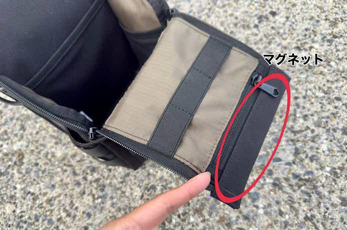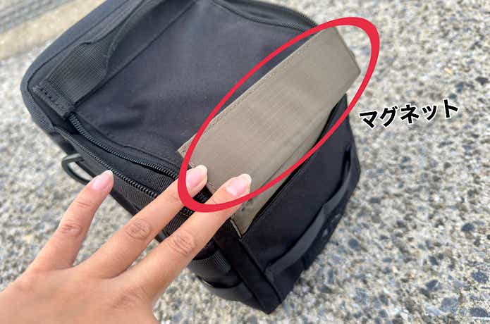 外側にはポケットが左右2個、フロントにマグネット蓋付きポケットが3個あります。